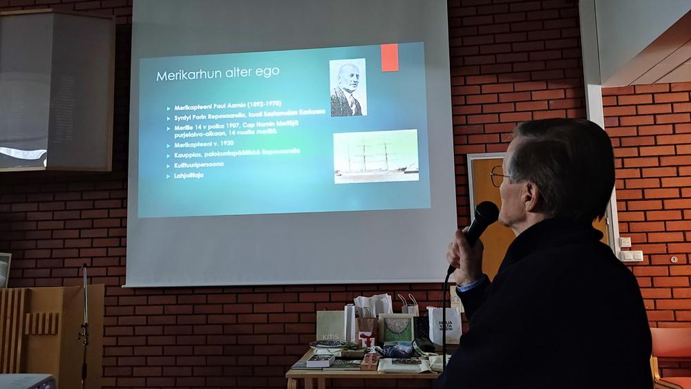 Rehtori Kari Mäntylä Porista esitteli ensin Lasse Lovénin ja Selkämeren kansallispuiston ystävät ry:n teoksen ’Merikarhun kierros. Tarinoita Kokemäenjoen varrelta’. Lasse Lovén oli itse estynyt kertomaan kirjastaan.